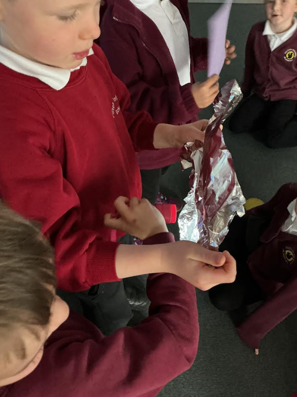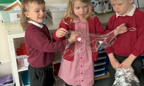 We have been testing which materials we believe make the best curtains in Year 1. We tested cling film, foil, cotton and card. We learned about opaque and transparent materials. We then used a torch to test if it let the light through. We wouldn't want transparent materials as it would let the sun in and wake us up! We decided to use cotton as it was opaque (did not let light through), soft and flexible (easy to move).