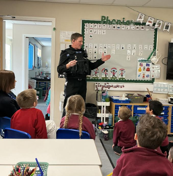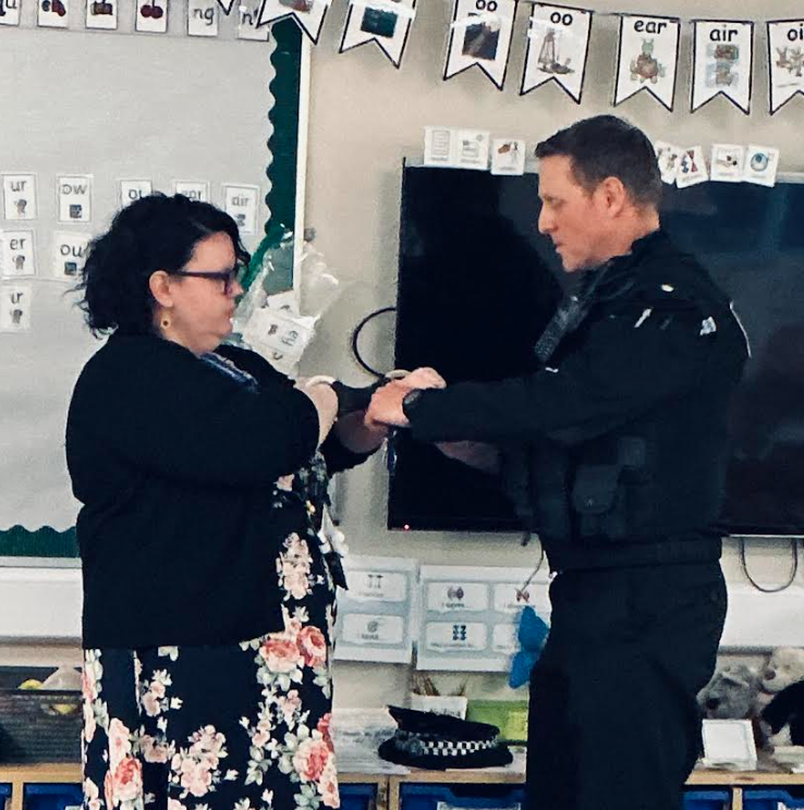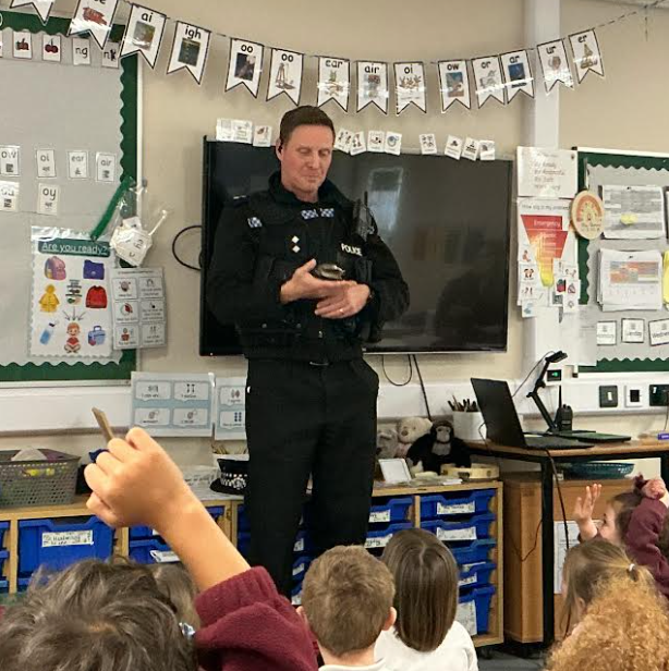We had DCI Richard Preston visiting us in Year 1. He told us all about his job working for Devon and Cornwall Police. He has to be very physically fit as he carries lots of equipment, including, irritant spray, torch, baton, handcuffs and radio. Mrs Powley even volunteered to show us how the handcuffs work. Luckily he remembered the key. The children were very engaged and had lots of questions which Richard was happy to answer.