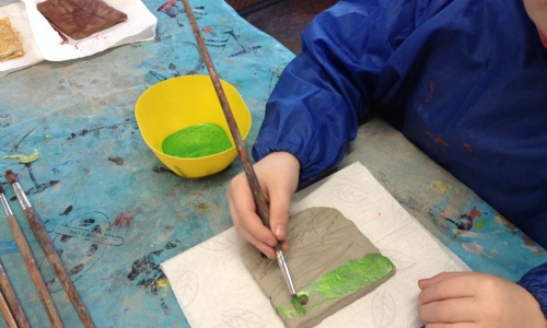 Now that our clay tiles have dried completely, we are ready to decorate them using our special paint. We are using acrylic ink to carefully colour each tile. We chose bright, shiny colours because they help the leaf prints stand out clearly and make the designs more eye-catching. We are taking our time to add colour thoughtfully and bring our patterns to life. Once the tiles are finished and fully dry, they will be added to our display in the school corridor for everyone to enjoy.