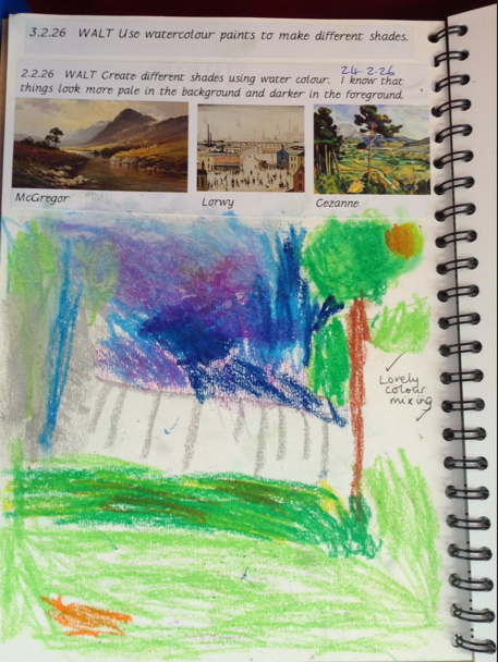 The children explored how these artists used colour to create perspective in their landscapes. They discovered that objects in the distance are often lighter and less detailed, while features in the foreground appear darker, brighter and more detailed. This clever use of colour and tone helps to make a painting look three-dimensional.