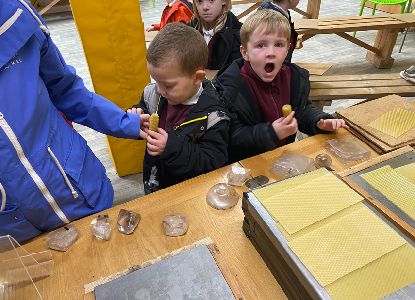 We had a wonderful time on our visit to the Honey Farm on Tuesday. During our trip, we learnt lots of fascinating facts about bees and how honey is made. We had the chance to look closely at real honeycomb and even moved the wax to taste the delicious honey inside.