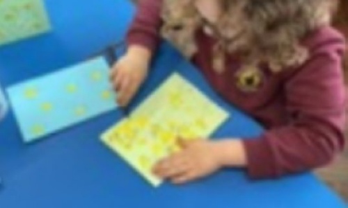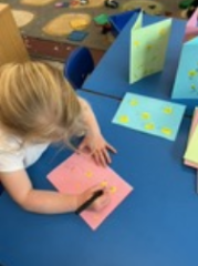 We have been busy making Easter cards this week. We did some fingerprinting onto the front of our cards and then we added more details to make the prints look like chicks. We learnt that cards always open with the fold on the left side, so we were careful to make sure our cards were the right way around.